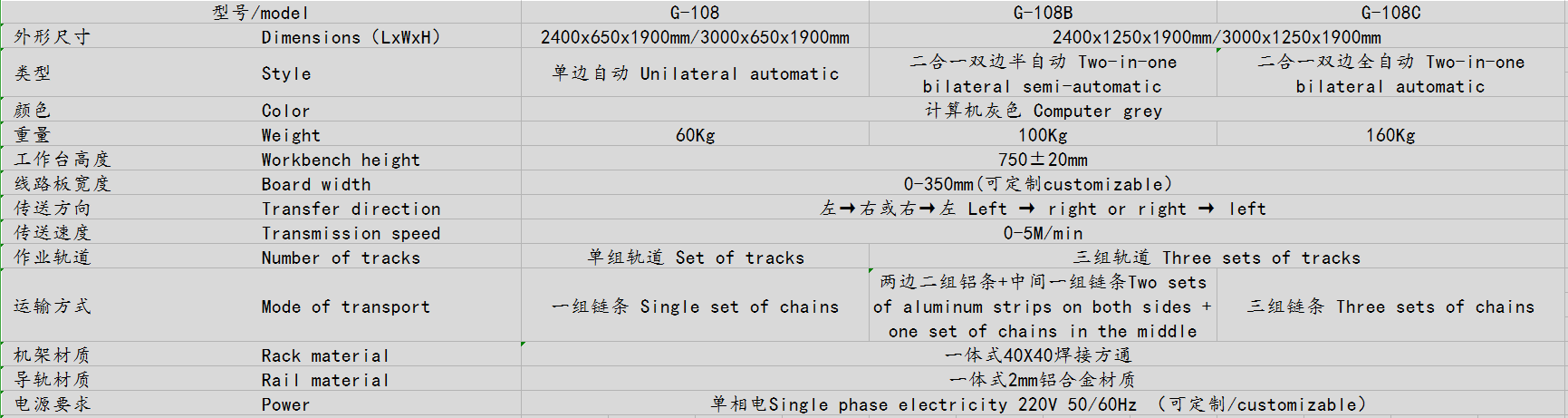 1、動力系統(tǒng):采用1Φ220V 60W調(diào)速馬達,速度V=1-5M/min可調(diào);傳送方向從左到右,傳輸鏈為優(yōu)質(zhì)尼龍鏈條
