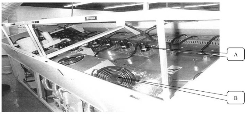 圖2-2-35 中B 處為熱風(fēng)冷卻循環(huán)系統(tǒng)。它將回流焊冷卻區(qū)中的熱空氣進(jìn)行冷卻再將冷空氣輸送到回流焊冷卻區(qū),達(dá)到更好的冷卻效果。