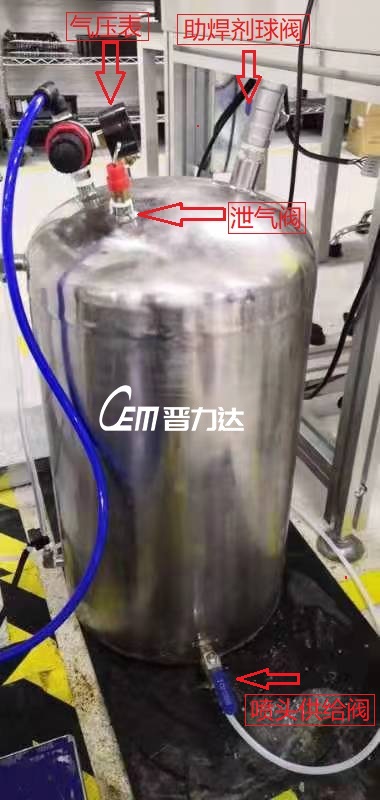 壓力罐也采用316不銹鋼制作,整體采用焊接密封,通過球閥注入助焊劑,關(guān)閉閥門,加注經(jīng)過干燥后的空氣壓力,通過氣壓擠出助焊劑至噴嘴處,能保證供液的穩(wěn)定和均勻性,對助焊劑穿透到焊盤內(nèi)有很大幫助,對后續(xù)波峰焊接上錫透錫至PCB板面很關(guān)鍵,助焊劑沒有穿透元件腳至焊盤孔內(nèi),錫就無法爬升至PCB表面。缺點是造價較高,維護(hù)較為困難,工程師需要一定的操作基礎(chǔ)。