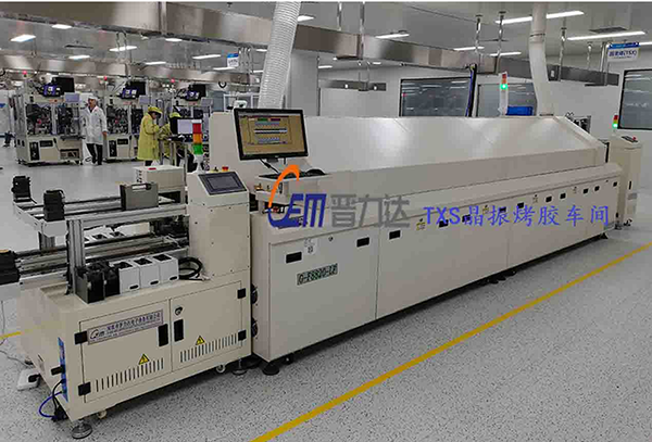 下圖為惠倫晶體重慶分公司TXS晶振烤膠事業(yè)部自動上下料機+固化雙軌回流(拍攝照片經(jīng)由客戶同意)